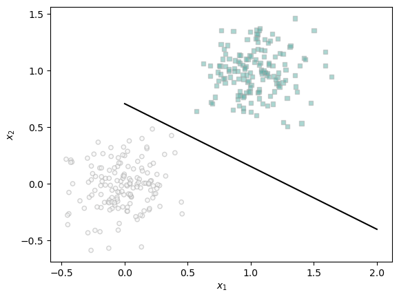 ax.set(xlabel = r"$x_1$", ylabel = r"$x_2$")Here is what are data looks like from the start. As we can see, it is very clearly linearly seperable.