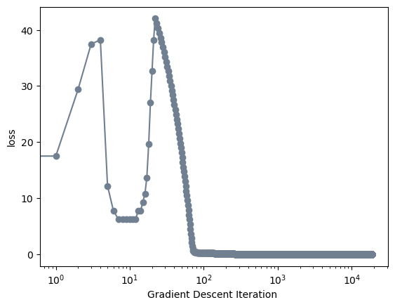 labs = plt.gca().set(xlabel = "Gradient Descent Iteration ", ylabel = "loss")
