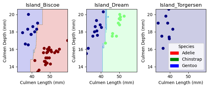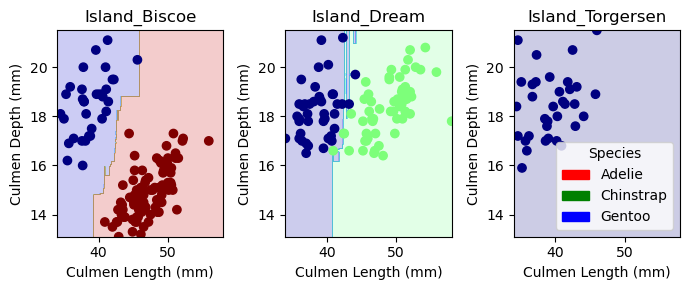 from matplotlib import pyplot as pltimport numpy as npfrom matplotlib.patches import Patchdef plot_regions(model, X, y): x0 = X[X.columns[0]] x1 = X[X.columns[1]] qual_features = X.columns[2:] fig, axarr = plt.subplots(1, len(qual_features), figsize = (7, 3))# create a grid grid_x = np.linspace(x0.min(),x0.max(),501) grid_y = np.linspace(x1.min(),x1.max(),501) xx, yy = np.meshgrid(grid_x, grid_y) XX = xx.ravel() YY = yy.ravel()for i inrange(len(qual_features)): XY = pd.DataFrame({ X.columns[0] : XX, X.columns[1] : YY })for j in qual_features: XY[j] =0 XY[qual_features[i]] =1 p = model.predict(XY) p = p.reshape(xx.shape)# use contour plot to visualize the predictions axarr[i].contourf(xx, yy, p, cmap ="jet", alpha =0.2, vmin =0, vmax =2) ix = X[qual_features[i]] ==1# plot the data axarr[i].scatter(x0[ix], x1[ix], c = y[ix], cmap ="jet", vmin =0, vmax =2) axarr[i].set(xlabel = X.columns[0], ylabel = X.columns[1], title = qual_features[i]) patches = []for color, spec inzip(["red", "green", "blue"], ["Adelie", "Chinstrap", "Gentoo"]): patches.append(Patch(color = color, label = spec)) plt.legend(title ="Species", handles = patches, loc ="best") plt.tight_layout()