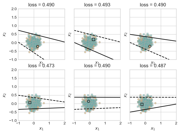 What if our data is not linearly seperable. In this next part, I make a completely random dataset. As we’ll see, it would be impossible to drawn a line in order to make a loss of 0.