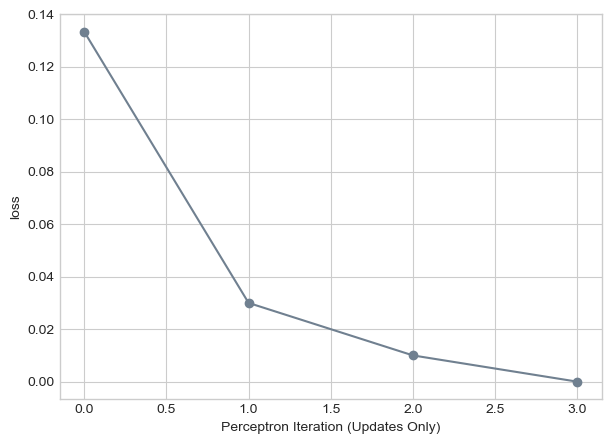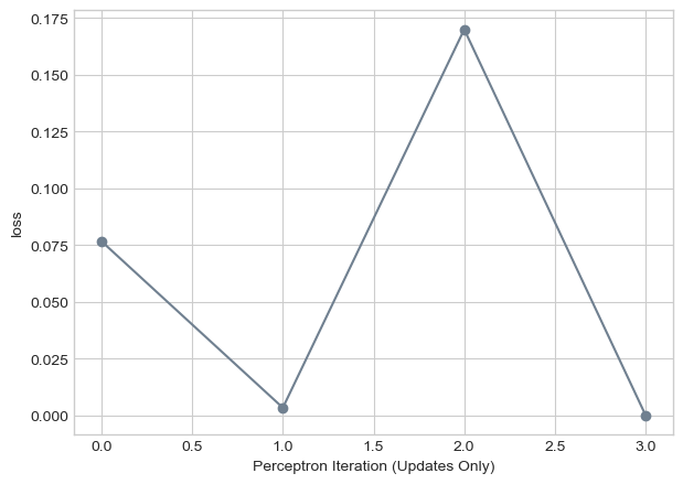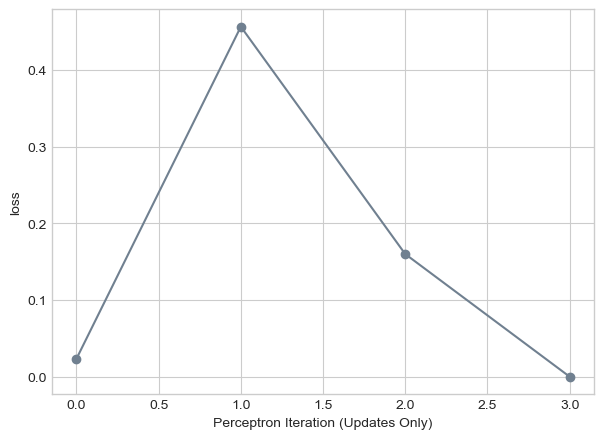 labs = plt.gca().set(xlabel = "Perceptron Iteration (Updates Only)", ylabel = "loss")