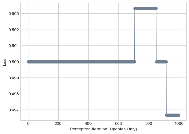 loss_vec = perceptron_loop(X_rand, y_rand, plot = True, plot_type = "adjacent")